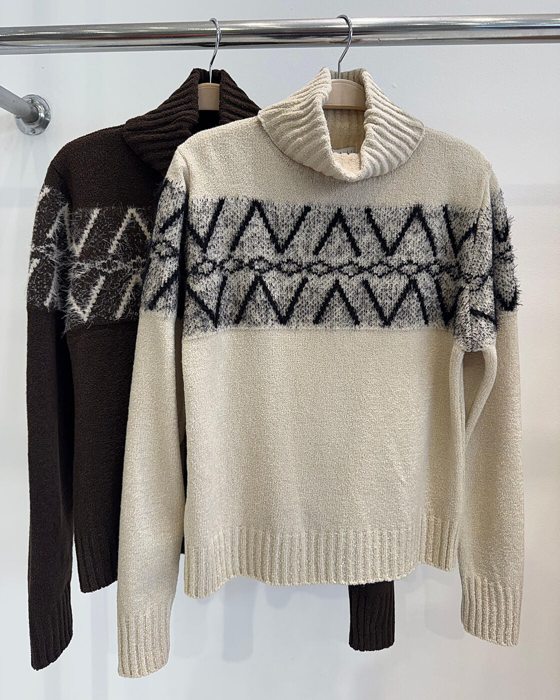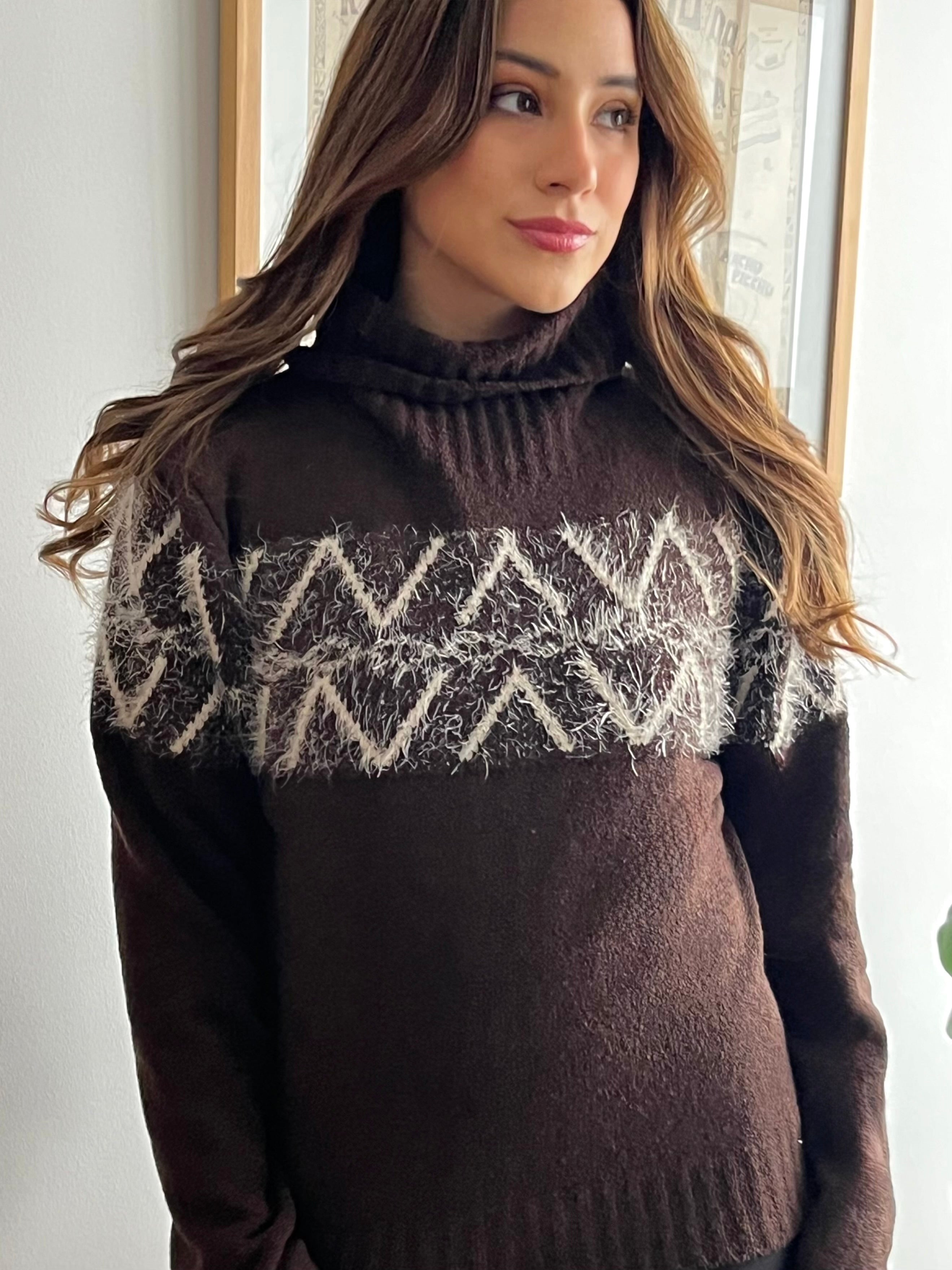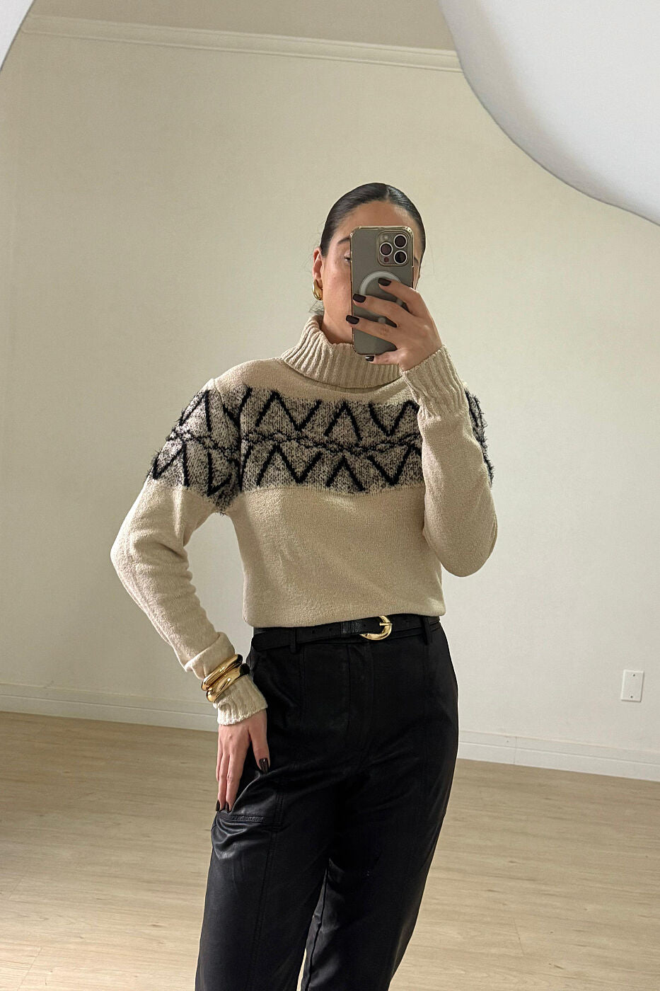 Con un equilibrio perfecto entre encanto y comodidad, la Chompa Helena combina elegancia y estilo en cada detalle. Tejida en punto jacquard de tacto suave, destaca por su diseño geométrico moderno con sutiles hilos de plumas que aportan un toque sofisticado y único. Su cuello alto, junto con los puños y el bajo acanalados, la convierten en la aliada ideal para los días más fríos, sin perder estilo.